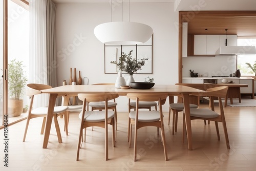 Scandinavian interior home design of modern dining room with chairs and wooden dining table with wooden furniture near the window