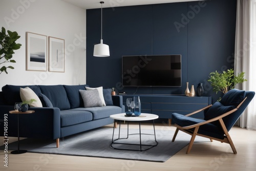 scandinavian Interior home design of modern living room with dark blue sofa and round table in the apartment