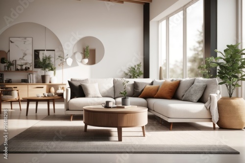 Scandinavian interior home design of modern living room with sofa chairs and round wooden table against white wall near the window