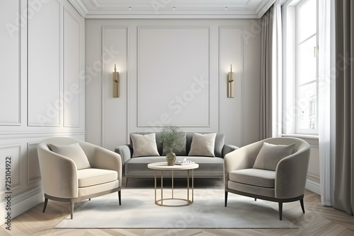 Scandinavian living room interior in light colors with two armchairs, gray sofa, pillows, coffee table, dired flowers in vase, mock up poster. House apartment design in a minimalist style