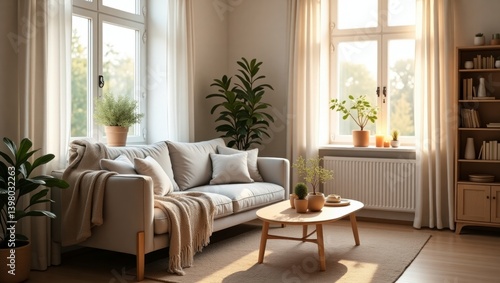 Scandinavian living room radiating warmth and comfort during golden hour with soft textiles and minimalist design elements creating a peaceful retreat for relaxation