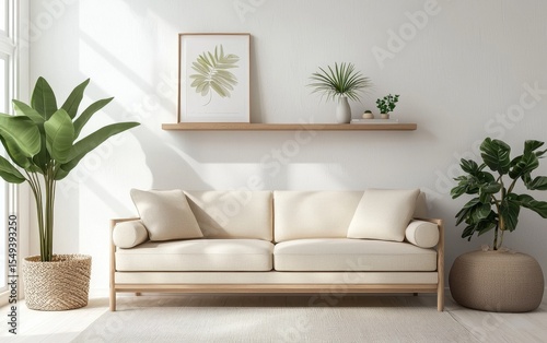 Scandinavian living room with a minimalist wooden shelf, neutral-colored sofa, and modern artwork