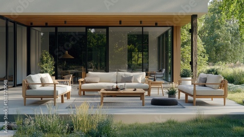 Scandinavian-inspired outdoor space with matching wooden furniture, soft cushions, and lush greenery under the open sky.