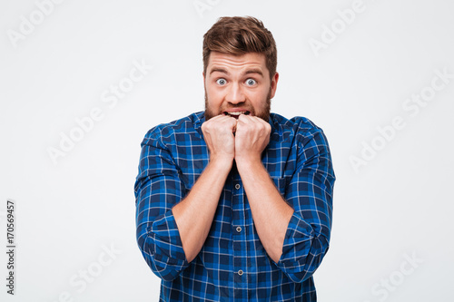 Scared man with hands near mouth looking camera