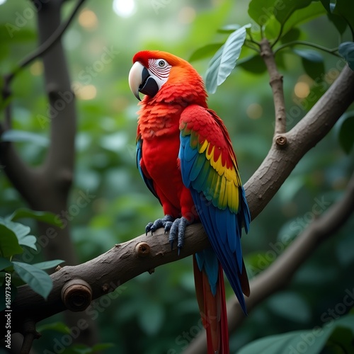 Scarlet and Green Macaws Perched in a Tropical Jungle
