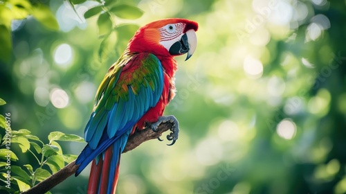 Scarlet macaw perched on a branch in lush green foliage.