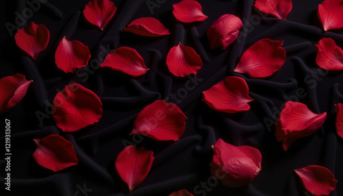 Scattered red flower petals on a black fabric background