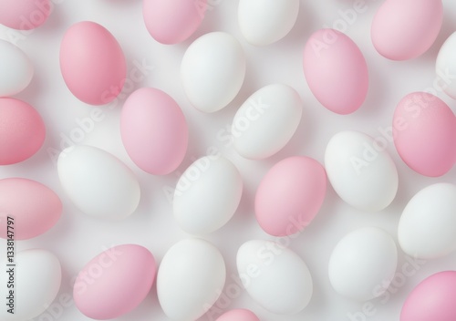Scattered White and Pink Easter Eggs on a Soft White Background