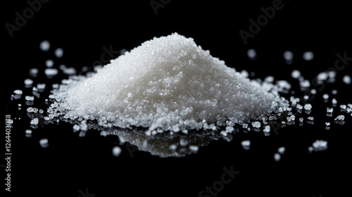 Scatters of sugar or salt crystals with white dust. Vector realistic set of stains of crushed pieces of chalk or sand, coarse culinary ground sea salt or sugar granules isolated on black background