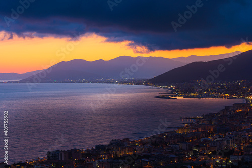 Scena panoramica con la vista sul mare di Borgio Verezzi, la sera, al tramonto. Pietra Ligure. Liguria. Viaggiare. Vacanze. Febbraio. Paesaggio marino.