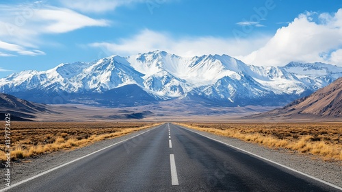Scenic highway stretches towards majestic snow-capped mountains under blue sky