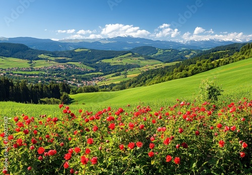 Scenic Landscape of Vibrant Red Flowers Overlooking Rolling Hills and Majestic Mountains Under a Clear Blue Sky in a Green Valley