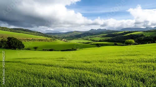 Scenic Lush Green Landscape with Rolling Hills and Dramatic Clouds under Blue Sky : Generative AI