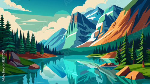 Scenic Mountain Lake Landscape with Pine Forest and Reflections – Vector Illustration