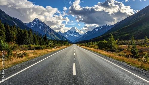 Scenic Mountain Road Leading to Snow Capped Peaks Under Clear Blue Sky with Fluffy Clouds and Green Trees in Natural Landscape