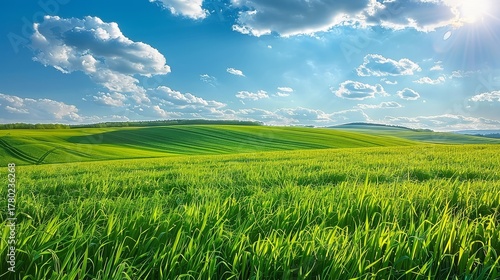 Scenic Rolling Hills of Green Grass Under a Blue Sky with Clouds Wide Angle Landscape Nature Photography
