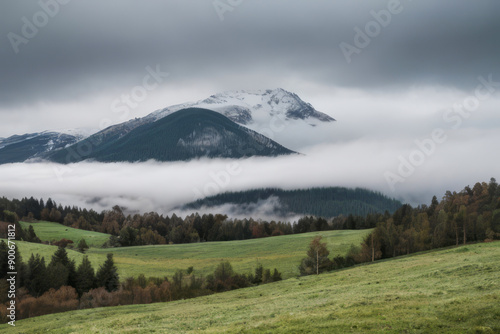Scenic Scottish mountain range with snow-capped peaks, lush green valleys, and fluffy clouds in the morning