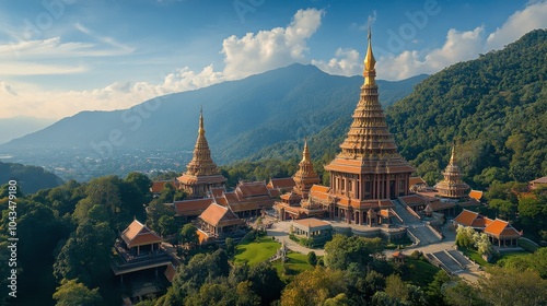 Scenic Temple Complex Surrounded by Mountains and Forest