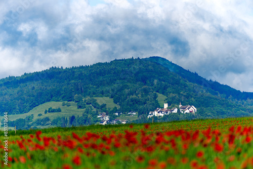 Scenic view of agriculture grain field with red poppies on a cloudy spring morning at Swiss village. Photo taken May 28th, 2024, Oberglatt, Canton Zurich, Switzerland.