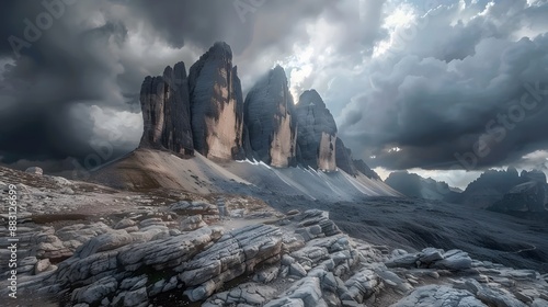 Scenic view of rough rocky formations in highland area under cloudy sky in Dolomites Mountain range.