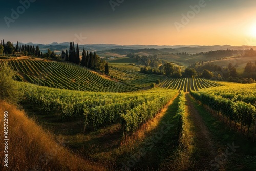 Scenic Vineyard Landscape at Sunset in Tuscany Italy with Rolling Hills and Cypress Trees