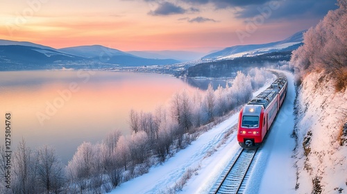 Scenic winter train journey through snowy mountains and lake at sunrise.