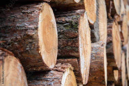 Schnittflächen von Baumstämmen mit Jahresringen.
