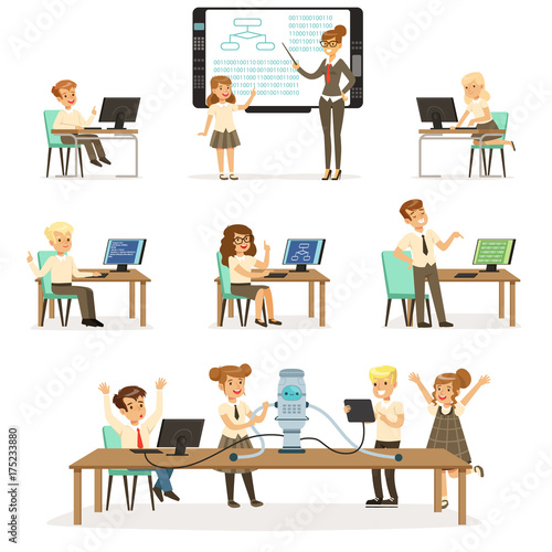 School children at the informatics and programming lesson set, teacher giving lesson in classroom, kids working on computers, learning robotics and programming vector Illustrations