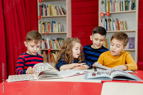 school children in the library reading books, doing homework, prepare a school project for lessons