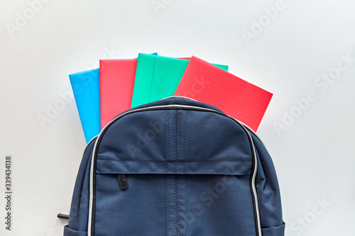 school, education and learning concept - backpack with notebooks on table