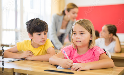 Schoolchildren doing test exercise during lesson. Boy cheating and looking in classmate's copy-book.