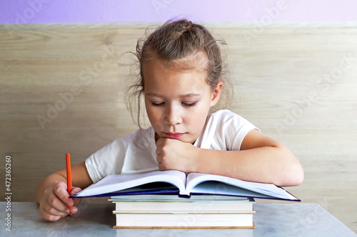 Schoolgirl girl reads books after school to know a lot