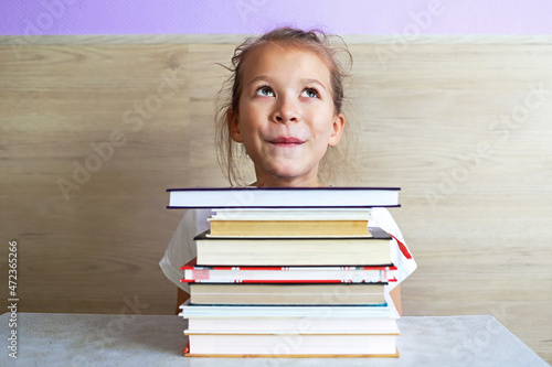 Schoolgirl girl reads books after school to know a lot