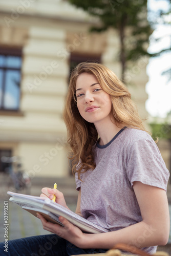 schülerin mit unterlagen auf dem schulhof