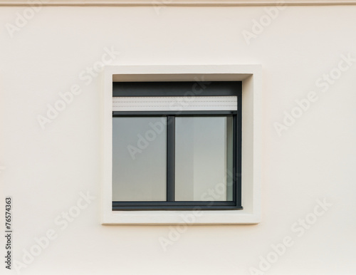 Schwarzes PVC Fenster mit weißem Rollladen