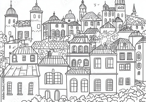 Schwarz-Weiß-Illustration einer europäischen Stadtlandschaft