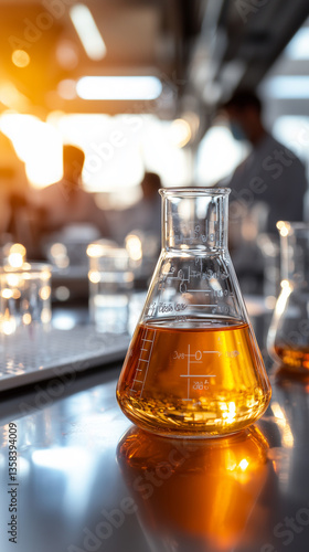Scientific Experimentation Concept Featuring Beaker with Liquid in Laboratory Context, Symbolizing Discovery and Innovation