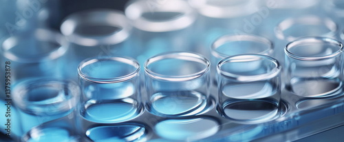 Scientific laboratory with blue liquid-filled test tubes and blurred microscope in the background. Perfect medical, pharmaceutical, research, and science-themed concept image.