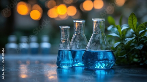 Scientific Research Blue Liquid in Erlenmeyer Flasks with Blurred Bokeh Background