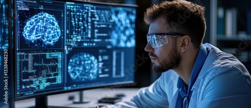 Scientist Analyzing Brain Data on Multiple Monitors in Modern Lab