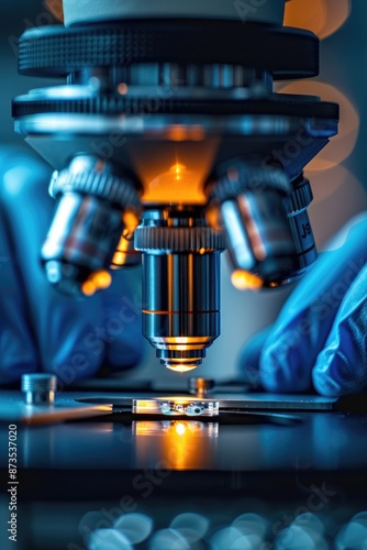 Scientist Examining Samples Under Microscope: Close-Up of Lens and Hands in Laboratory Setting