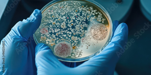 Scientist hand in blue gloves holding a petri dish with different bacteria or virus samples.