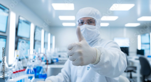 Scientist in Cleanroom Suit Giving Thumbs-Up in Laboratory