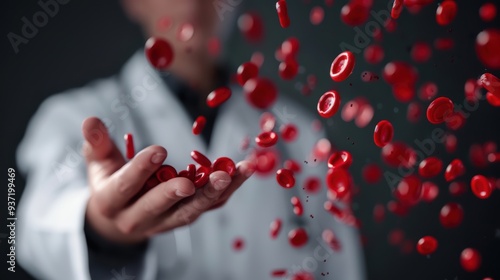 Scientist in Lab Coat Holding Out Hand with Floating Red Blood Cells in Focus