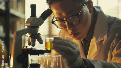 Scientist in lab coat holding vial ofexperimental drug, with microscope and scientific equipment, symbolizing drug trials and medical researchprocess