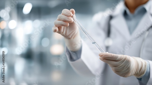Scientist meticulously analyzes fluid sample in sterile laboratory setting, seeking breakthrough discovery.