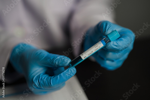 Scientist or medical in lab coat holding test tube with reagent, Laboratory glassware containing chemical liquid, Microscope, Biochemistry laboratory research