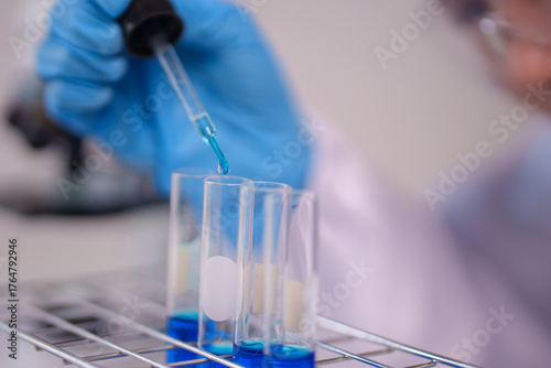 Scientist performing laboratory experiment analyzing blue liquid with dropper in modern research facility developing new solutions