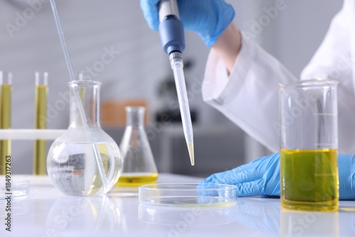Scientist with dripping motor oil into Petri dish at table in laboratory, closeup