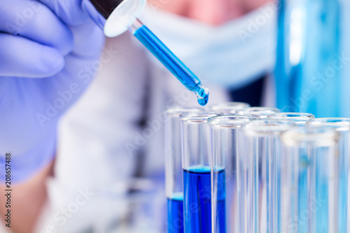 Scientist with pipette and test tubes and blue liquid water drop fall.